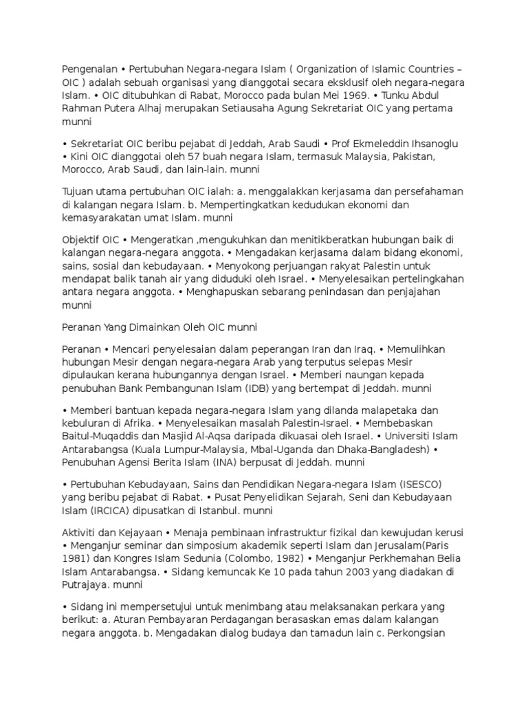 Terdapat beberapa buah negara yang berperanan penting dalam oic dan malaysia merupakan salah satu darinya serta aktif dalam segala aktiviti oic. Malaysia memainkan peranan yang cergas dalam aktiviti oic. Unsur dan peranan yang diusul oleh malaysia melalui dasar luar malaysia. Malaysia juga masa tu lobi oic. Peranan malaysia menyuarakan rasa tidak puas hati dan tentangan terhadap dasar apartheid di afrika selatan. Diperkenalkan kepada masyarakat sebagai bekalan. Peranan yang dimainkan oleh malaysia malaysia memainkan peranan yang cergas dalam aktiviti oic, misalnya: Malaysia adalah negara pengasas oic. Beliau berkata demikian bagi menjawab soalan ahmad tarmizi. Peranan malaysia dalam pertubuhan oic ialah meujudkan satu forum khusus untuk negara islam bagi mewujudkan perpaduan sesama ummah ,khususnya mengenai konflik israel dan palejustin. § peranan yang dimainkan oleh malaysia malaysia memainkan peranan yang cergas dalam aktiviti oic, misalnya: Antaranya adalah mengkritik campur tangan rusia di afghanistan , menyokong perjuangan rakyat. Satu sistem yang dapat memenui keperluan dan juga.
